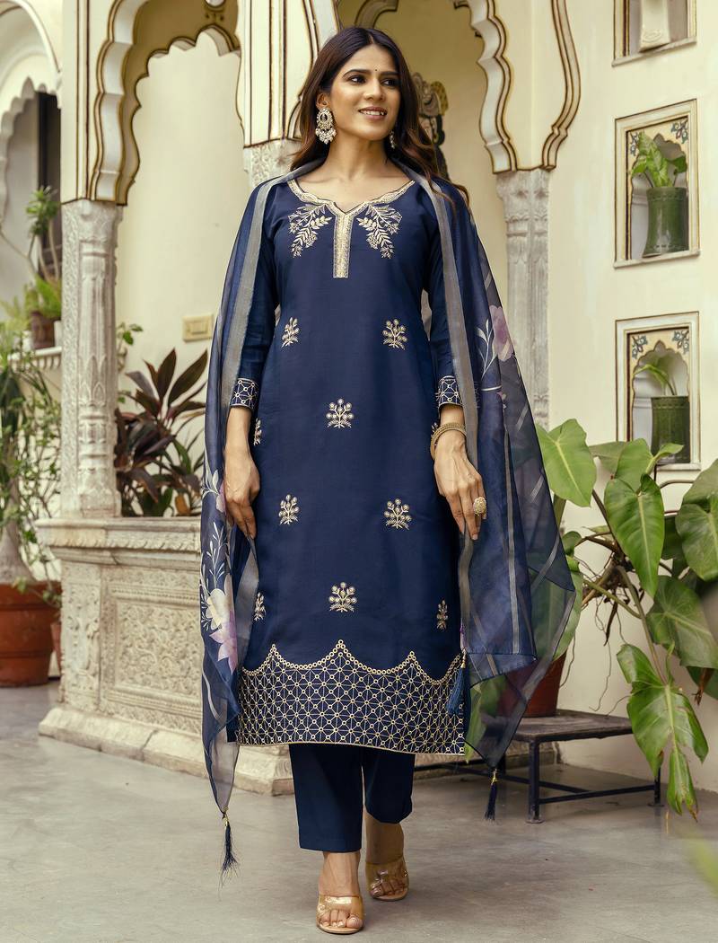 Women's Navy Blue Viscose Chanderi Silk Embroidered Kurta Pant Set With Jacquard Organza Dupatta