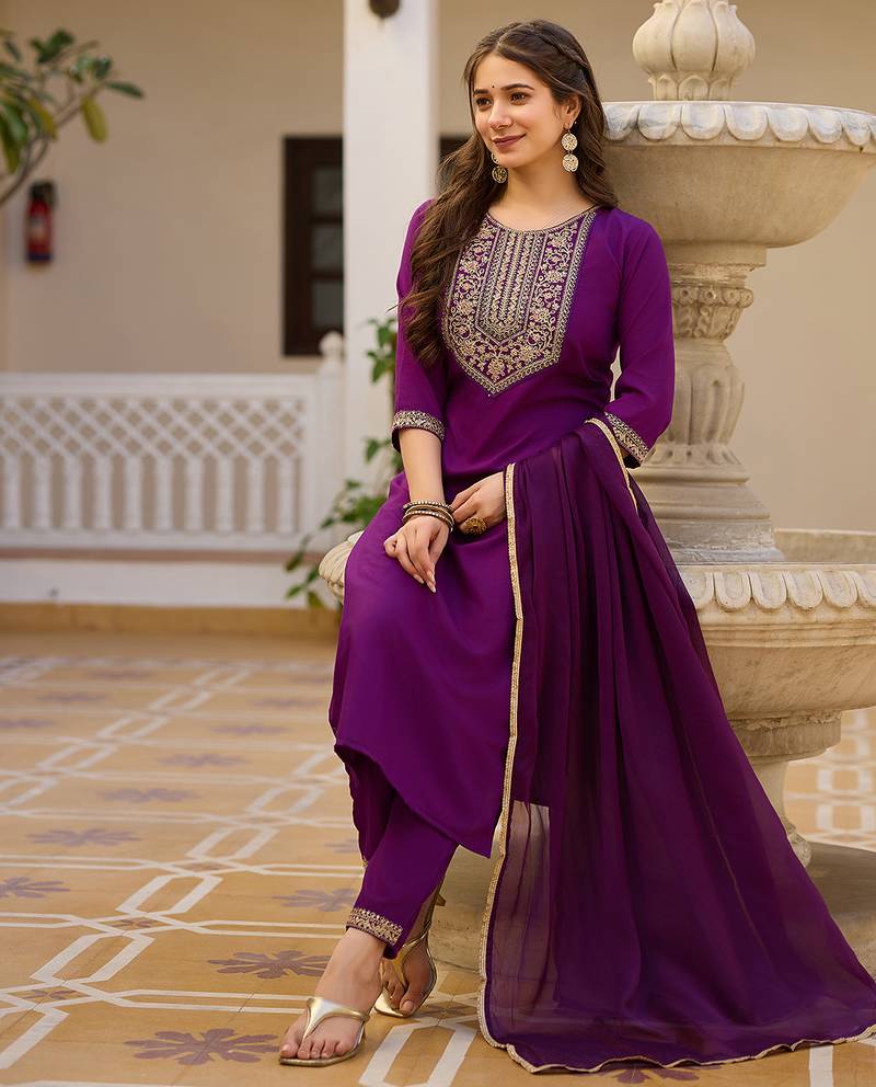 Upgrade your ethnic wardrobe with this elegant Women's Rayon Sequin Stone Embroidery Round Neck Purple Kurta Pant Set with Solid Chinon Dupatta. Crafted from soft and breathable rayon fabric, this stylish kurta set for women combines comfort with festive elegance. The beautifully designed maroon kurta features delicate sequin stone embroidery on a classic round neck, offering a sophisticated look inspired by traditional Anarkali Suit, Pakistani Suit, and Churidar Suit styles.