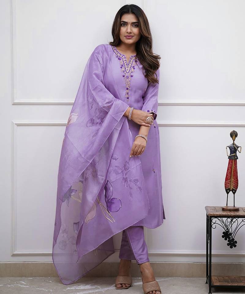 Refresh your festive wardrobe with this elegant Lavender kurta set for women, crafted from soft rayon silk for a smooth texture and graceful drape. Designed with a flattering V-neck and detailed embroidery, this ensemble captures the charm of premium embroidered-kurtis and festive-inspired heavy-work-kurtis styling.
