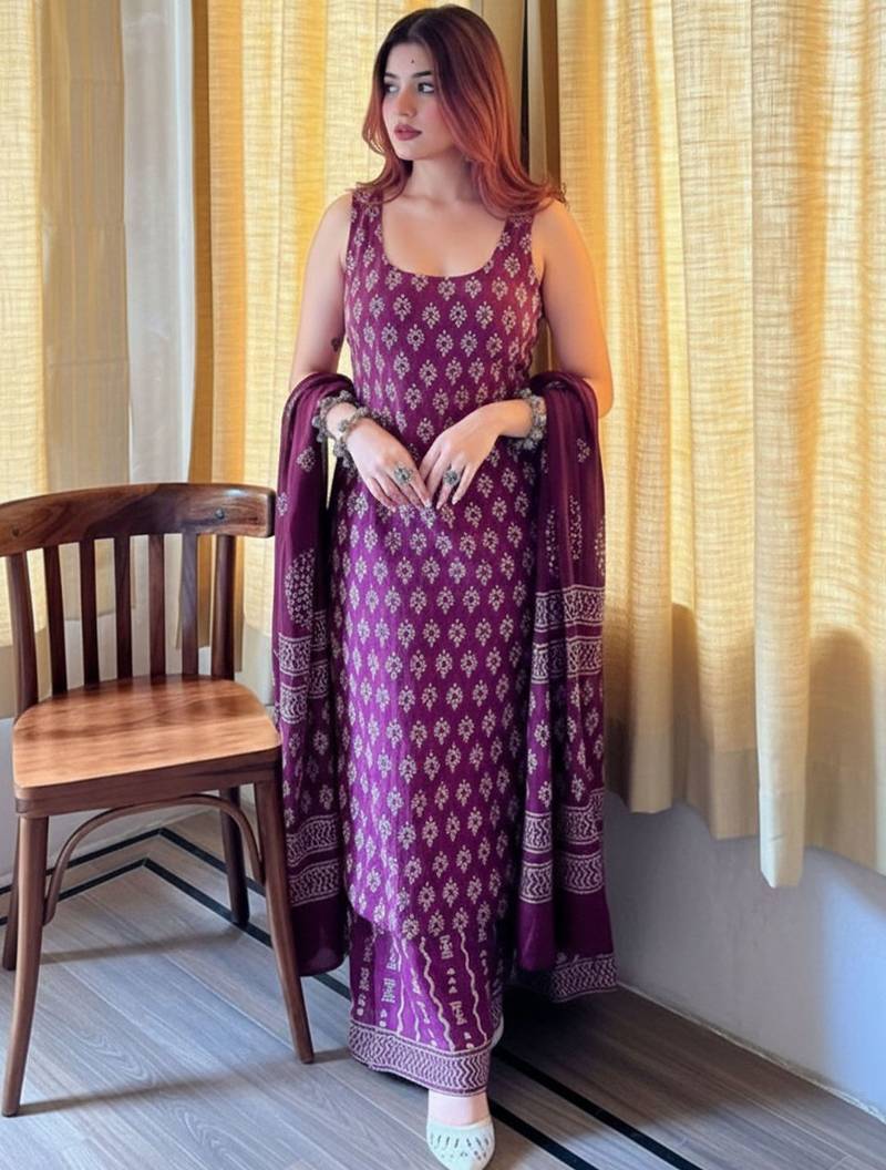 Paired with a beautifully printed Chanderi cotton dupatta, this outfit forms a complete salwar suit set with dupatta, perfect as a graceful women's indian salwar kameez set. The rich purple shade makes it ideal for both daytime celebrations and evening events.
