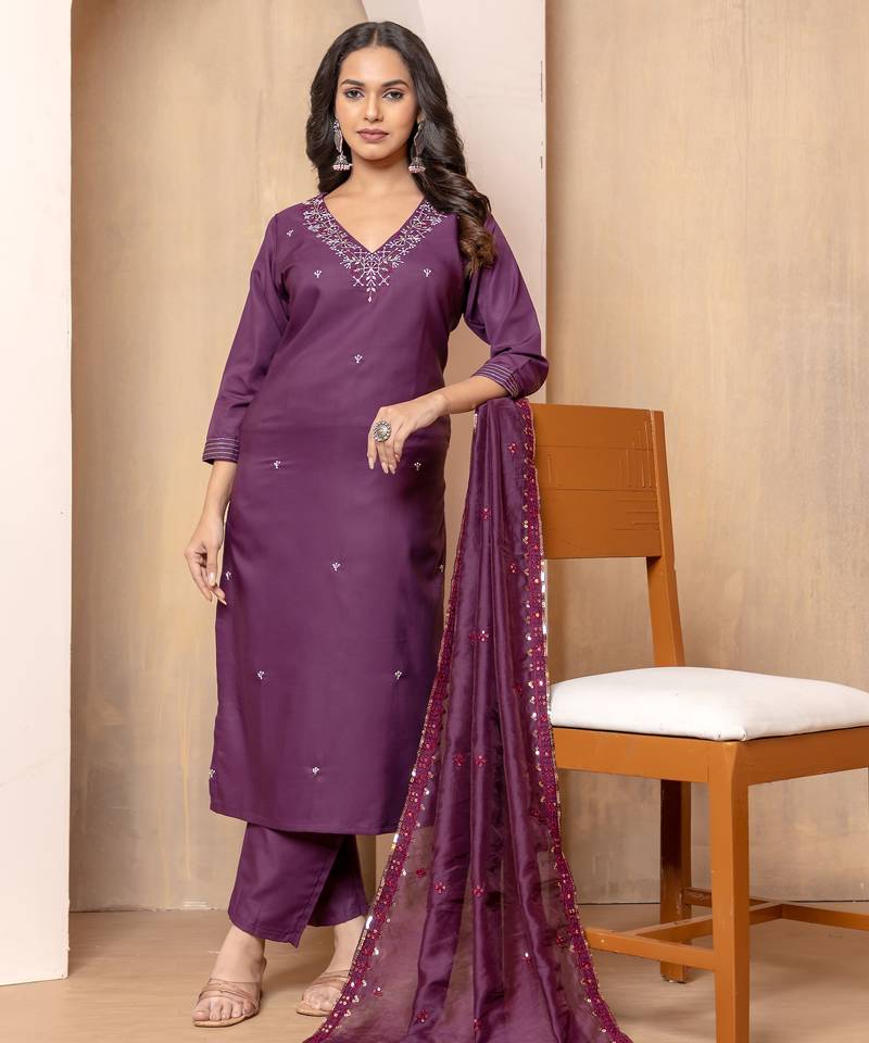 Elevate your festive and occasion wear collection with this luxurious kurta set for women crafted in rich Roman silk. Designed in a graceful V-neck pattern, this elegant purple ensemble features intricate embroidery that reflects the charm of classic embroidered-kurtis and premium designer kurta sets.