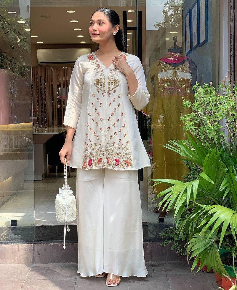 The V-neck kurta features delicate sequin embroidery that adds a subtle shimmer and rich festive appeal. The classic white shade gives this outfit a sophisticated and elegant look, making it suitable for both daytime and evening celebrations. Paired with a stylish silk sharara, the outfit creates a graceful and flowy silhouette that reflects traditional ethnic fashion with a modern touch.