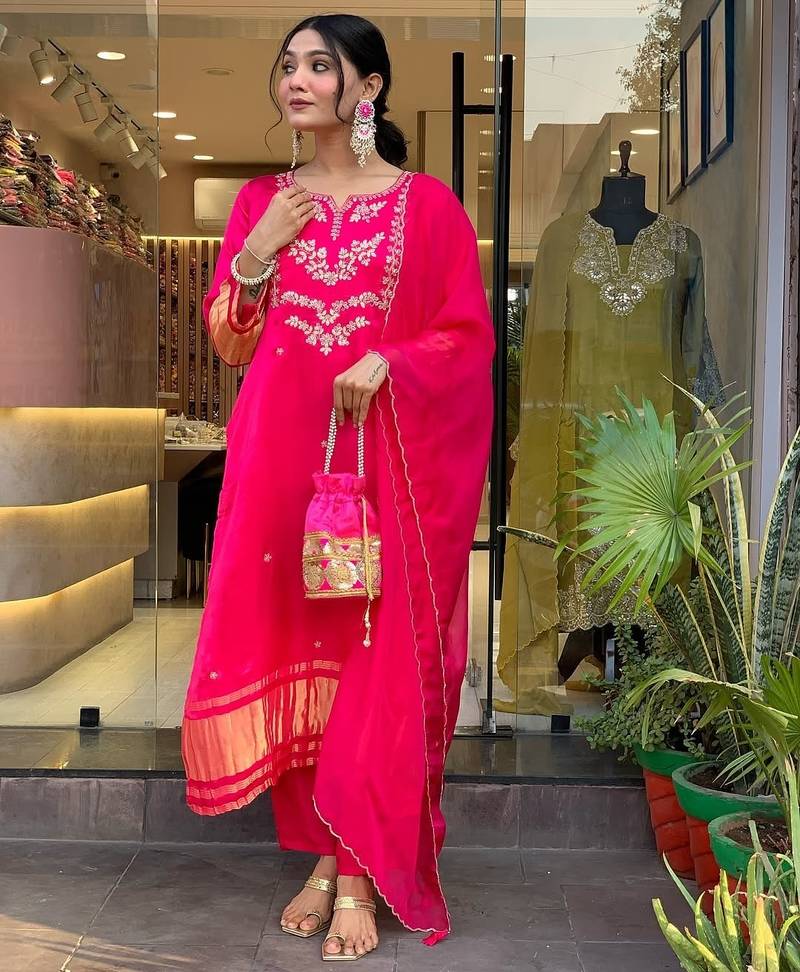 The coordinated pants are tailored to create a sleek silhouette influenced by the classic Churidar Suit design, ensuring both comfort and elegance. Paired with a beautifully embroidered Chanderi dupatta, this ensemble forms a complete salwar suit set with dupatta, perfect as a premium women's indian salwar kameez set.