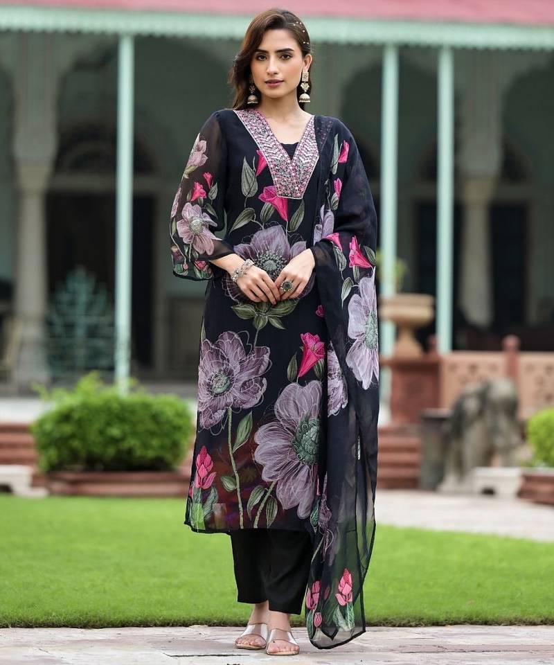Refresh your ethnic wardrobe with this elegant Black kurta set for women, crafted in soft and flowy georgette fabric. Designed with a flattering V-neck and delicate embroidery, this outfit beautifully blends the charm of embroidered-kurtis with graceful floral prints for a timeless appeal.