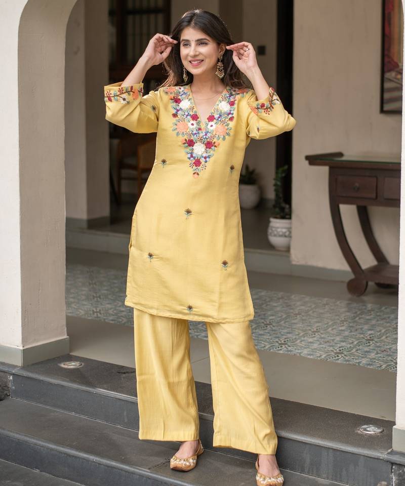 • Product Id : 4751448 • Package Details : 1 Kurta:1 Pant • Type : Kurta Sets • Region : Optimized For Luxury E Commerce Platforms In India, Usa, Uk, Canada, And The Uae, Targeting High End Festive And Wedding Guest Apparel. • Fabric : Crepe • Work : Embroidered • Type : Sequins Work • Look : Fashion • Sleeve : Quarter Sleeve • Neck Style : V Neck • Color : Yellow • Stitching : Stitched • Length : 42.0 • Side Slit : Yes General - Color and Texture may have slight variation. This happens because of photography.