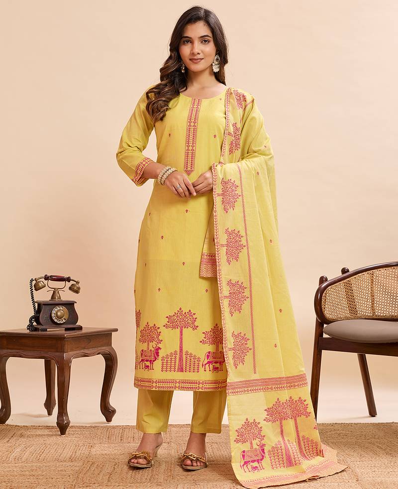 If you find the product for less we'll match it! Know MoreBrighten your wardrobe with this vibrant yellow kurta set crafted from 100% pure cotton. Featuring elegant jacquard weaving with beautiful tree and traditional animal motifs, this outfit reflects a rich cultural charm. The straight-cut kurta with round neck and full sleeves offers both comfort and style. Paired with matching bottoms and a coordinated dupatta with contrasting pink accents, this breathable ensemble is perfect for festive gatherings, casual outings, and daytime celebrations.