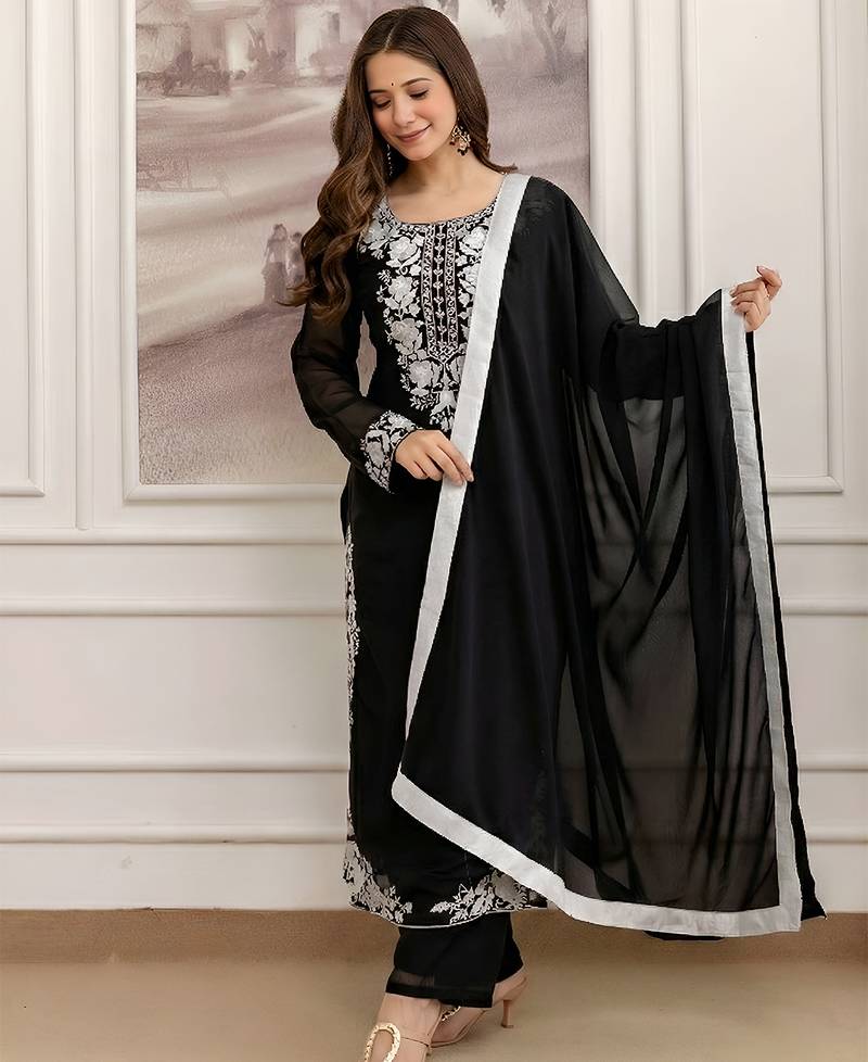 Top Fabric:-Georgette, Top Color:-Black, Bottom Fabric:-Georgette, Bottom Color:-Black, Dupatta Fabric:-Georgette, Dupatta Color:-Black, Work:-Heavy Thread Embroidery Work, Remark:-Kurta Pant Set (Size - S,M,L,XL,XXL), Note:-There might be slight color variation due to lightings & flash while photo shoot.