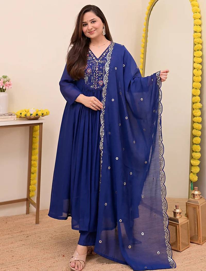 • Product Id : 4679938 • Package Details : 1 Top/1 Bottom/1 Dupatta • Type : Kurta Sets • Work : Embroidered • Type : Thread Work • Look : Fashion • Sleeve : Quarter Sleeve • Neck Style : V Neck • Color : Blue • Fabric : Chanderi Silk • Stitching : Stitched • Length : 47.0 Payments [+]