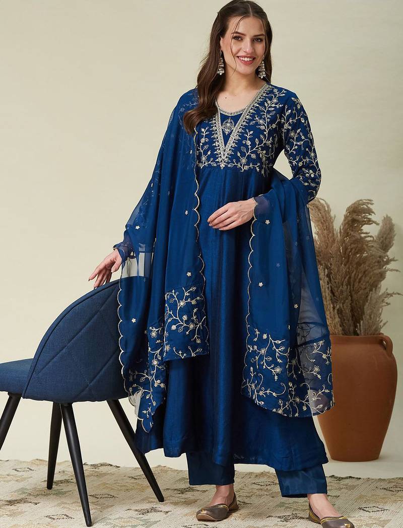• Product Id : 4679438 • Package Details : 1 Top/1 Bottom/1 Dupatta • Type : Kurta Sets • Work : Embroidered • Type : Thread Work • Look : Fashion • Sleeve : Quarter Sleeve • Neck Style : U Neck • Color : Blue • Stitching : Stitched • Fabric : Vichitra Silk • Length : 45.0 Payments [+]