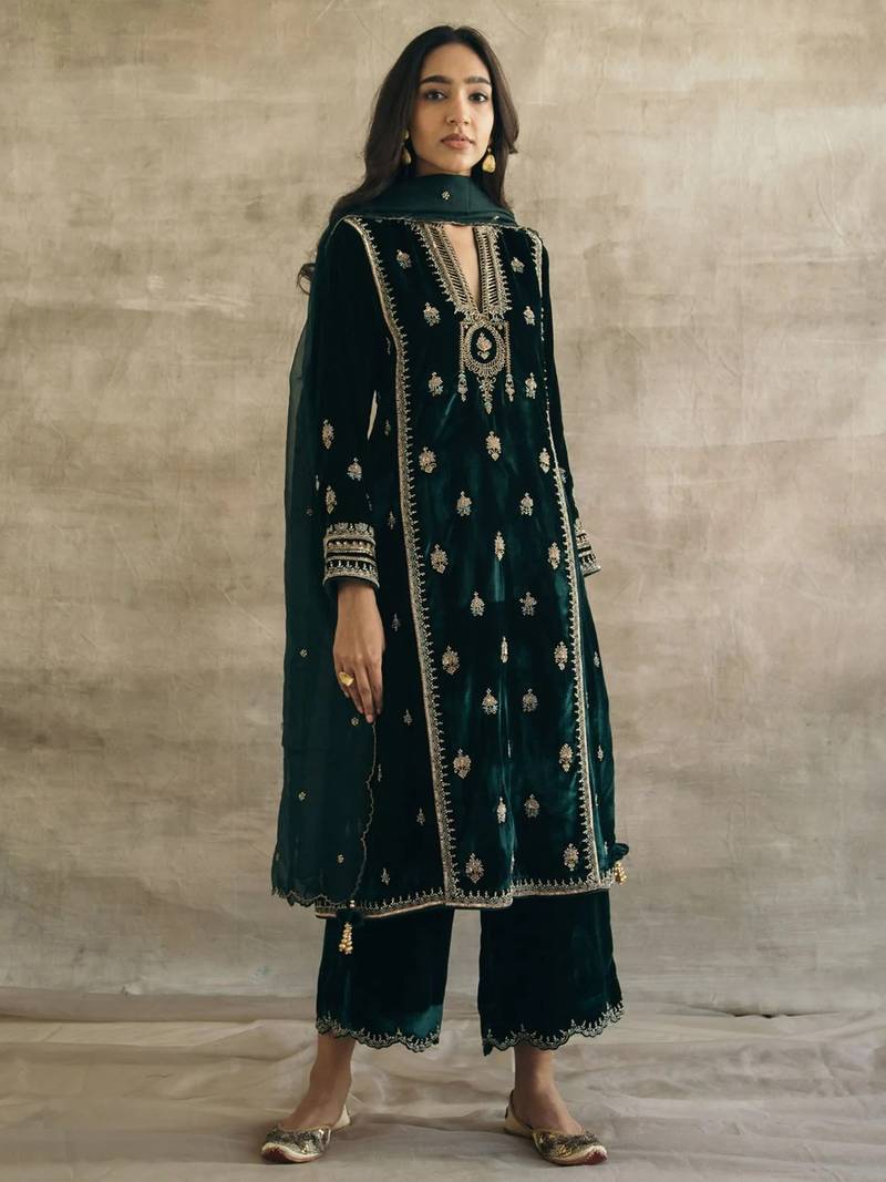 Bottle Green Velvet Heavy Thread Embroidery Work Kurta Pant Set