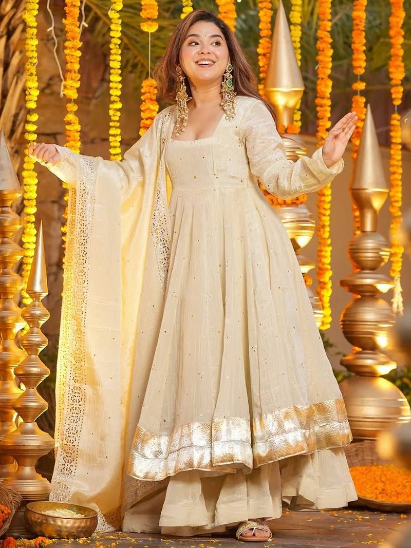 Top Fabric:-Chinon, Top Color:-Cream, Bottom Fabric:-Chinon, Bottom Color:-Cream, Dupatta Fabric:-Chinon, Dupatta Color:-Cream, Work:-Heavy Thread Embroidery Work, Remark:-Kurta With Palazzo Set (Size - S,M,L,XL,XXL), Note:-There might be slight color variation due to lightings & flash while photo shoot.
