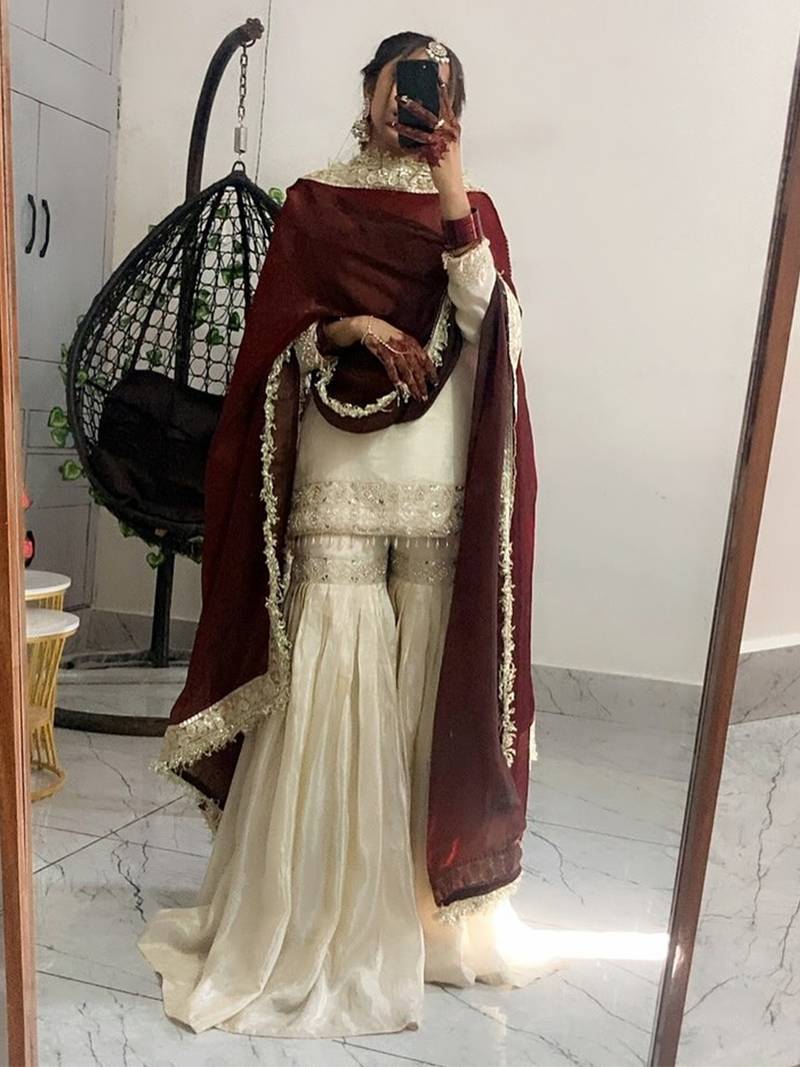 Top Fabric:-Chinon Silk, Top Color:-Cream, Bottom Fabric:-Chinon Silk, Bottom Color:-Cream, Dupatta Fabric:-Frendy Silk, Dupatta Color:-maroon, Work:-Heavy Thread Embroidery Work, Remark:-Kurta With Sharara Set (Size - S,M,L,XL,XXL), Note:-There might be slight color variation due to lightings & flash while photo shoot.