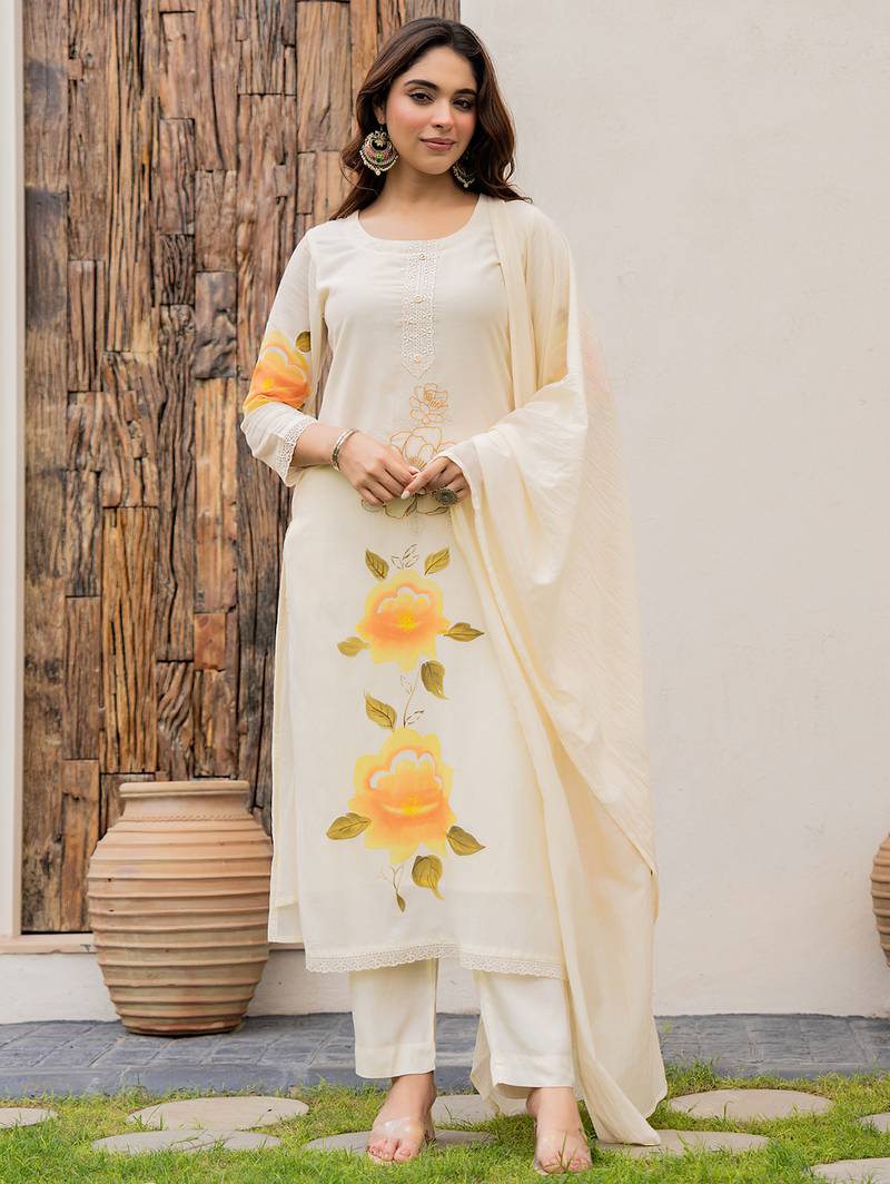 Top Fabric:-Viscose Chanderi, Top Color:-Cream, Bottom Fabric:-Viscose Chanderi, Bottom Color:-Cream, Dupatta Fabric:-Chanderi, Dupatta Color:-Cream, Work:-Print With Thread Embroidery Work, Remark:-Kurta Pant Set (Size - S,M,L,XL,XXL), Note:-There might be slight color variation due to lightings & flash while photo shoot.