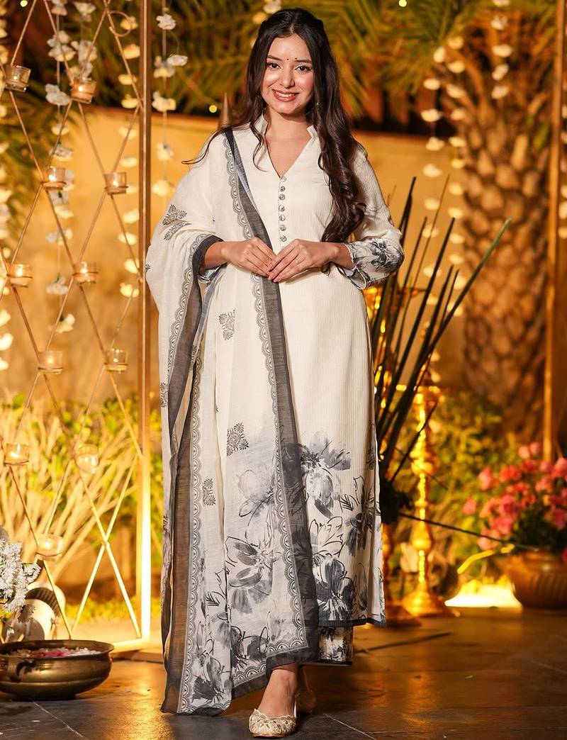 Top Fabric:-Viscose Chanderi, Top Color:-Cream, Bottom Fabric:-Viscose Chanderi, Bottom Color:-Cream, Dupatta Fabric:-Chanderi, Dupatta Color:-Cream, Work:-Printed, Remark:-Kurta Pant Set (Size - S,M,L,XL,XXL), Note:-There might be slight color variation due to lightings & flash while photo shoot.