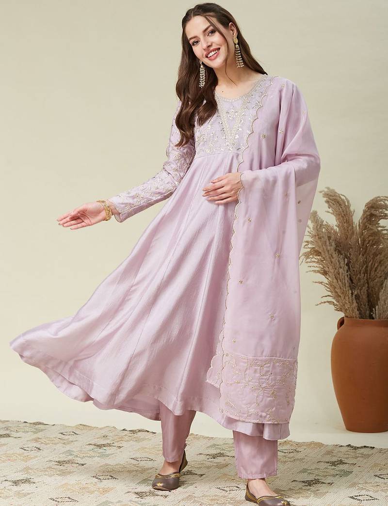 Top Fabric:-Vichitra Silk, Top Color:-Lavender, Bottom Fabric:-Chanderi, Bottom Color:-Lavender, Dupatta Fabric:-Vichitra, Dupatta Color:-Lavender, Work:-Heavy Thread Embroidery Work, Remark:-Kurta Pant Set (Size - S,M,L,XL,XXL), Note:-There might be slight color variation due to lightings & flash while photo shoot.