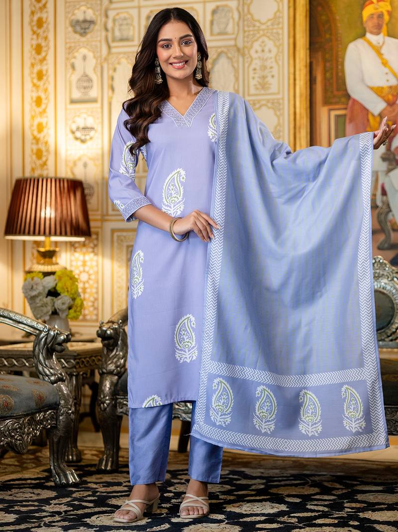 Top Fabric:-Rayon, Top Color:-Light Purple, Bottom Fabric:-Rayon, Bottom Color:-Light Purple, Dupatta Fabric:-Chanderi Cotton, Dupatta Color:-Light Purple, Work:-Printed, Remark:-Kurta Pant Set (Size - S,M,L,XL,XXL), Note:-There might be slight color variation due to lightings & flash while photo shoot.
