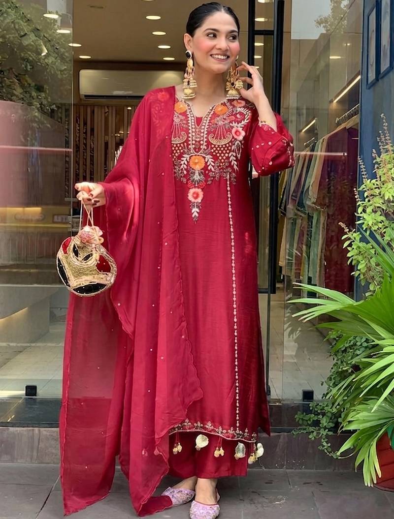 Top Fabric:-P.V Chanderi, Top Color:-Maroon, Bottom Fabric:-P.V Chanderi, Bottom Color:-Maroon, Dupatta Fabric:-P.V Chanderi, Dupatta Color:-Maroon, Work:-Heavy Thread Embroidery Work, Remark:-Kurta Pant Set (Size - S,M,L,XL,XXL), Note:-There might be slight color variation due to lightings & flash while photo shoot.