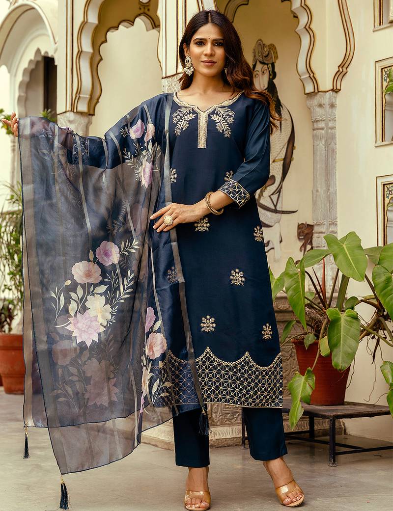 Top Fabric:-Viscose Chanderi, Top Color:-Navy Blue, Bottom Fabric:-Viscose Chanderi, Bottom Color:-Navy Blue, Dupatta Fabric:-Jacquard Orgazna, Dupatta Color:-Navy Blue, Work:-Heavy Thread Embroidery Work With Printed Dupatta, Remark:-Kurta Pant Set (Size - S,M,L,XL,XXL), Note:-There might be slight color variation due to lightings & flash while photo shoot.