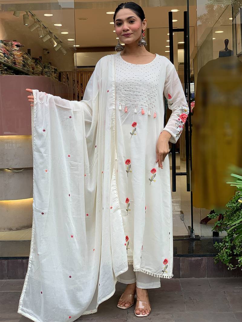 • Product Id : 4679934 • Package Details : 1 Top/1 Bottom/1 Dupatta • Type : Kurta Sets • Work : Embroidered • Type : Thread Work • Look : Fashion • Sleeve : Quarter Sleeve • Neck Style : Round Neck • Color : Off White • Fabric : Chanderi Silk • Stitching : Stitched • Length : 45.0 Payments [+]