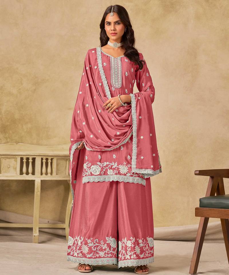 Top Fabric:-Chinon, Top Color:-Pink, Bottom Fabric:-Chinon, Bottom Color:-Pink, Dupatta Fabric:-Chinon, Dupatta Color:-Pink, Inner Fabric:-Santoon, Work:-Heavy Thread Embroidery Work, Remark:-Palazzo Suit (Palazzo Fully Free Size Stitched)