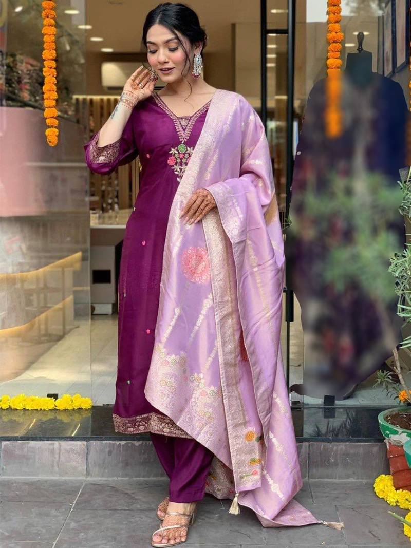 Purple Chanderi Heavy Thread Embroidery Work With Jacquard Dupatta Kurta Pant Set