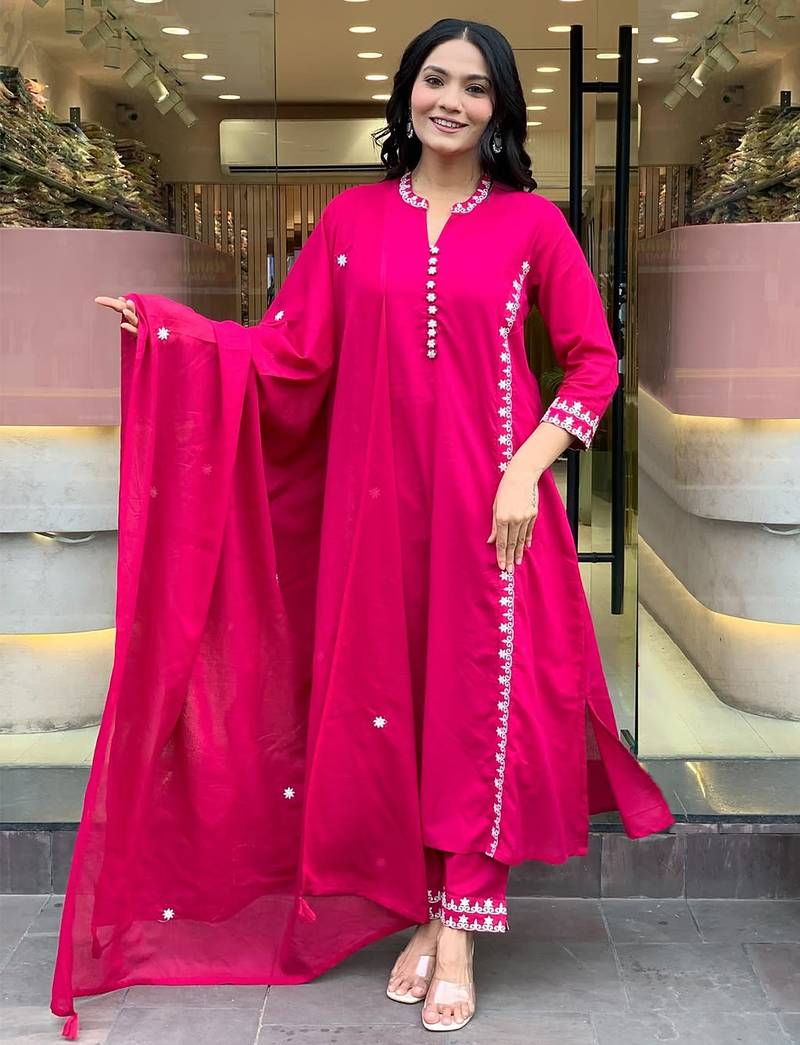 Top Fabric:-P.V Chanderi, Top Color:-Rani Pink, Bottom Fabric:-Rayon, Bottom Color:-Rani Pink, Dupatta Fabric:-Chanderi, Dupatta Color:-Rani Pink, Work:-Heavy Thread Embroidery Work, Remark:-Kurta Pant Set (Size - S,M,L,XL,XXL), Note:-There might be slight color variation due to lightings & flash while photo shoot.