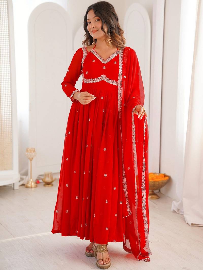 Top Fabric:-Georgette, Top Color:-Red, Bottom Fabric:-Viscose, Bottom Color:-Red, Dupatta Fabric:-Georgette, Dupatta Color:-Red, Work:-Heavy Thread Embroidery Work, Remark:-Kurta Pant Set (Size - S,M,L,XL,XXL), Note:-There might be slight color variation due to lightings & flash while photo shoot.