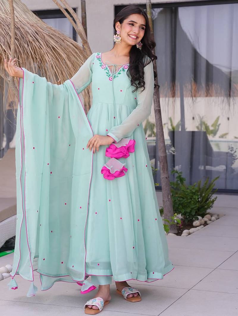 Top Fabric:-Georgette, Top Color:-Sky Blue, Bottom Fabric:-Viscose, Bottom Color:-Sky Blue, Dupatta Fabric:-Georgette, Dupatta Color:-Sky Blue, Work:-Heavy Thread Embroidery Work, Remark:-Kurta Pant Set (Size - S,M,L,XL,XXL), Note:-There might be slight color variation due to lightings & flash while photo shoot.