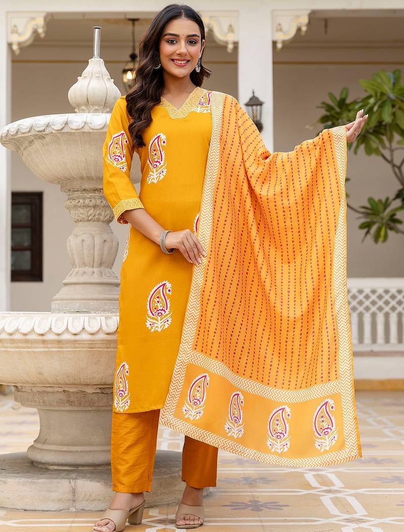 Top Fabric:-Rayon, Top Color:-Yellow, Bottom Fabric:-Rayon, Bottom Color:-Yellow, Dupatta Fabric:-Chanderi Cotton, Dupatta Color:-Yellow, Work:-Printed, Remark:-Kurta Pant Set (Size - S,M,L,XL,XXL), Note:-There might be slight color variation due to lightings & flash while photo shoot.