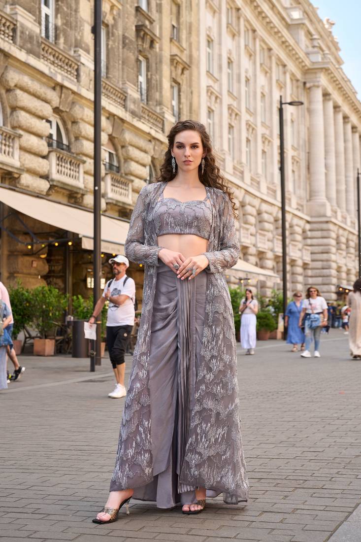 Grey Crepe Sequins Readymade Suits Free Size Up To 42 Stitched