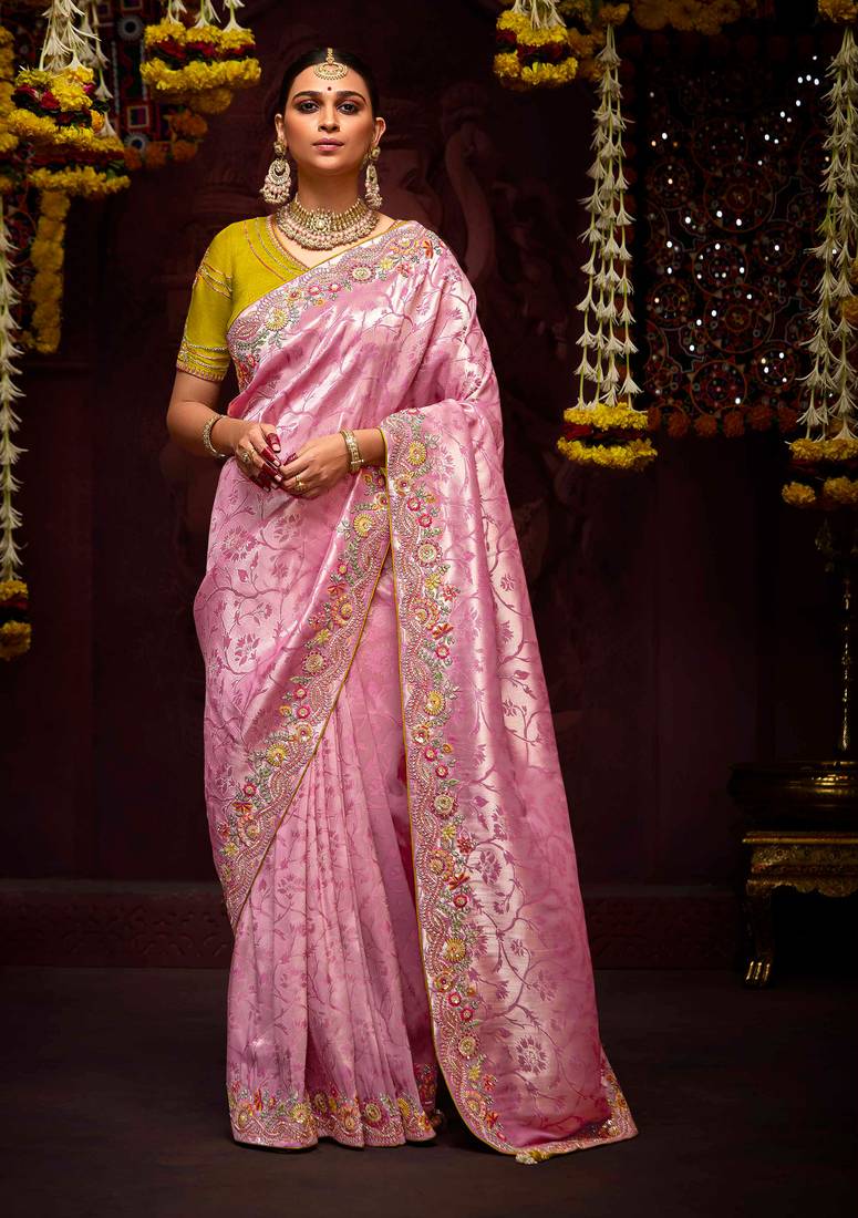• Saree : Color- Pink / Fabric- Banarasi Silk • Blouse : Color- Olive / Fabric- Silk Saree Details