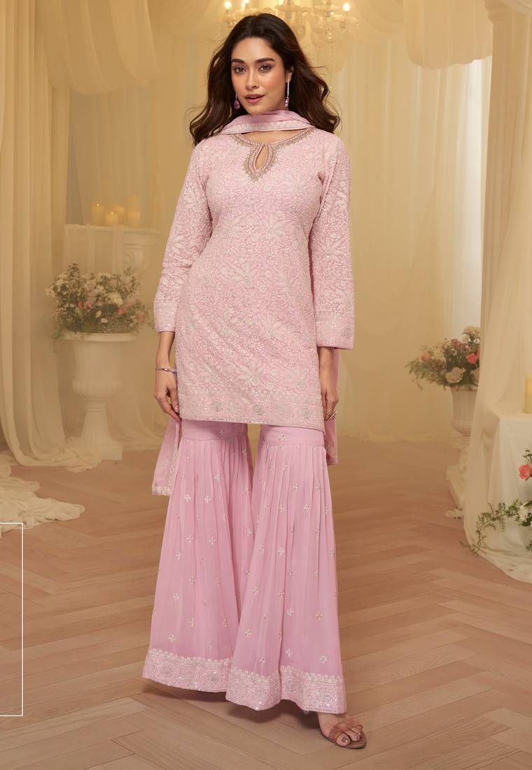 • Product Id : 4708540 • Package Details : 1 Top / 1 Bottom / 1 Duptta • Type : Readymade Suits For Women • Work : Embroidered • Sleeve : Full Sleeve • Fabric : Georgette • Color : Pink • Stitching : Stitched Stitching [+]
