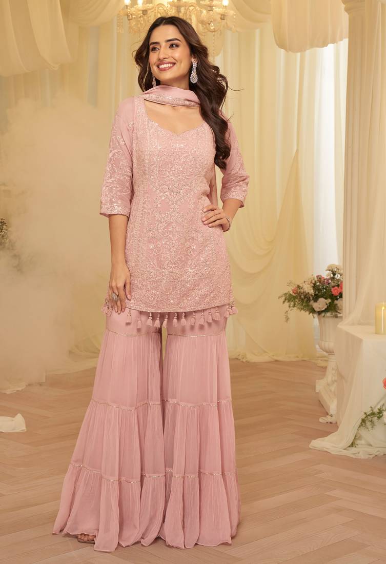 Pink Georgette Sequins Readymade Suits Free Size Up To 42 Stitched