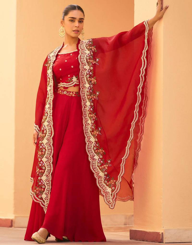 Red Chinnon Silk Crop Top Palazzo With Golden Zari Thread Floral Embroidery And Sequin Full Stitched Free Size