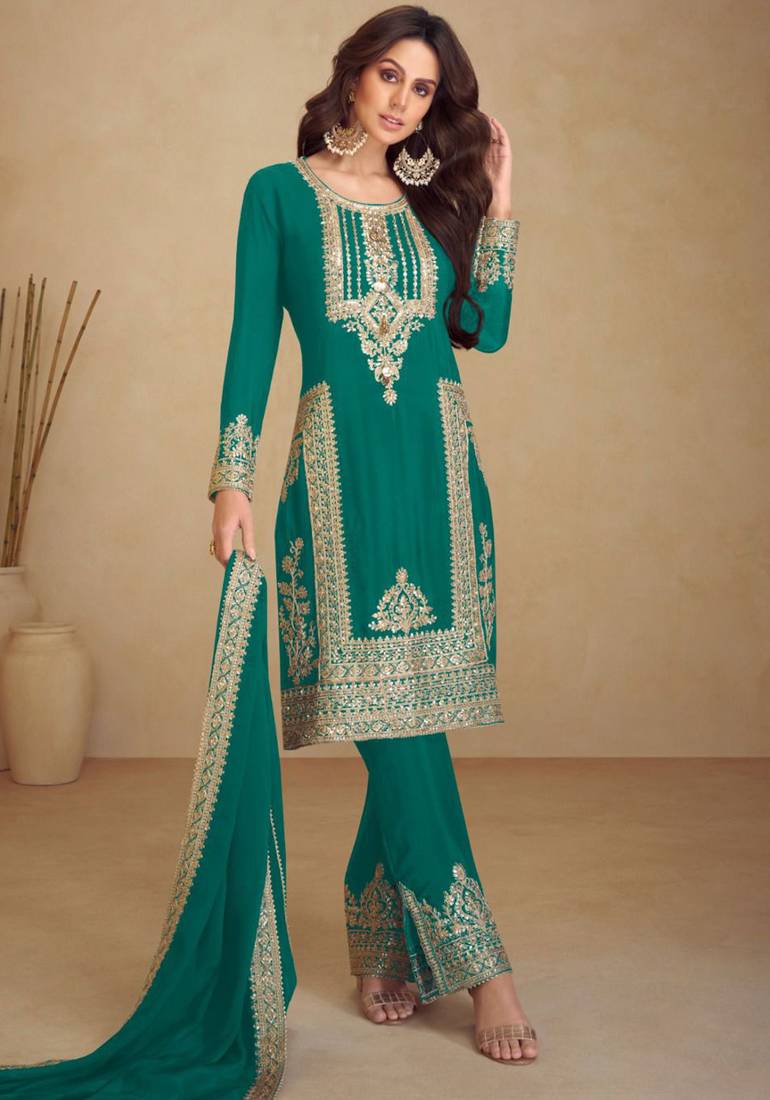 • Product Id : 4621621 • Package Details : 1 Top / 1 Bottom / 1 Dupatta • Type : Readymade Suits For Women • Work : Embroidered • Type : Sequins Work • Look : Traditional • Sleeve : Full Sleeve • Neck Style : U Neck • Fabric : Art Silk • Color : Teal • Stitching : Stitched Stitching [+]