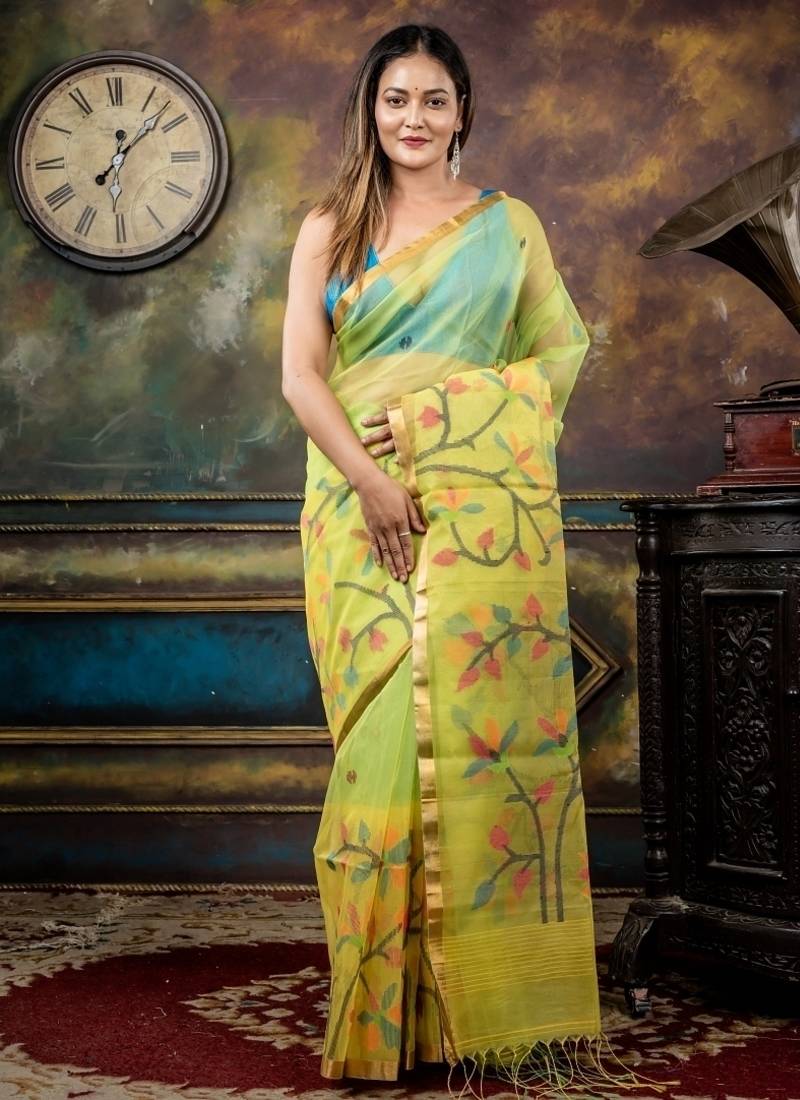 The Lime Green Premium Muslin Bengal Handloom Saree features all-over multi-colour jamdani buta, enhanced by a striking bright yellow floral jamdani ‘Mahapadh’ border & pallu that bring energy & elegance to the look.