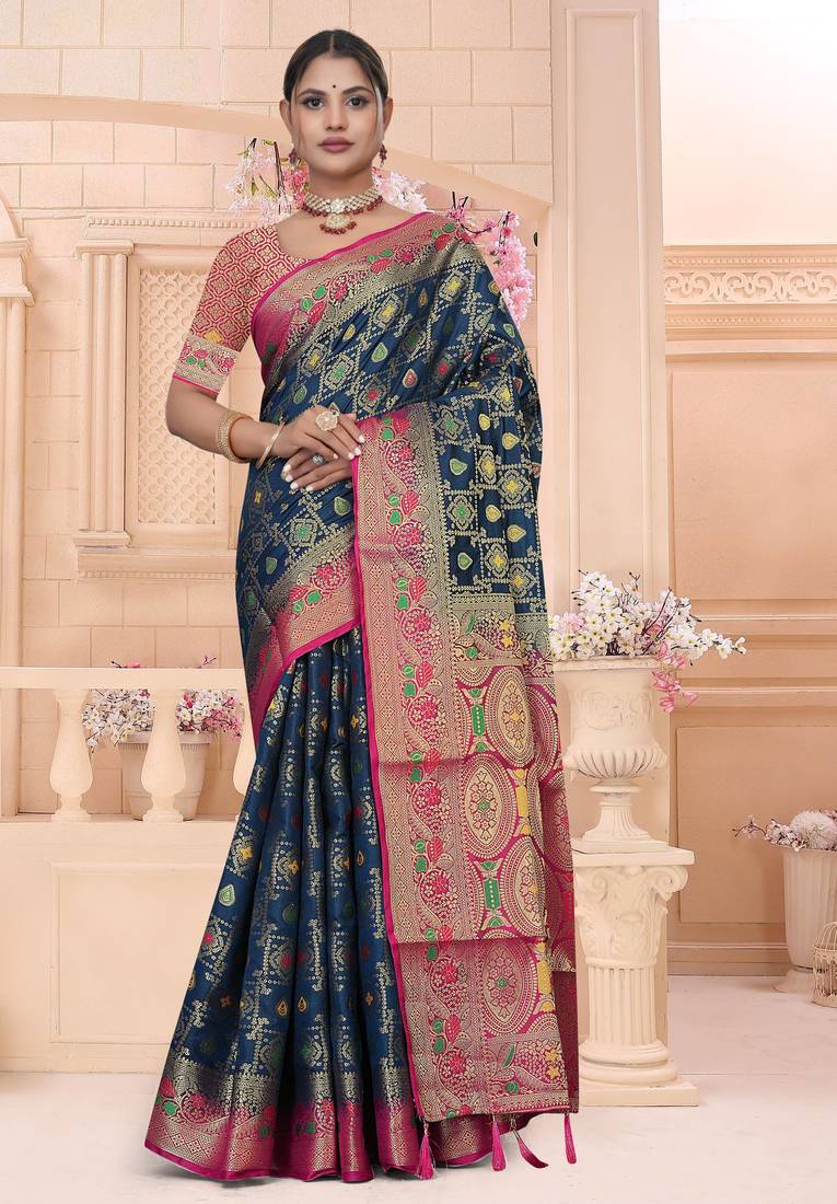 Elevate your festive look with this stunning Navy Blue Dola Silk Saree beautifully adorned with gold zari woven motifs across the body. The saree is highlighted with a rich rani pink zari border and an eye-catching designer pallu, giving it a luxurious Banarasi-inspired appeal.