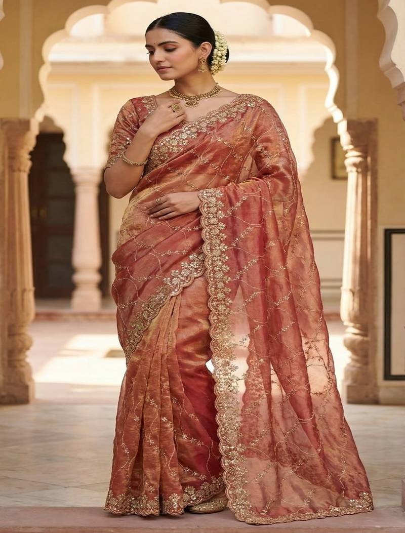 Peach Pure Space Silk Saree With Beautiful Sequence Embroidery Work With Cut Work Border