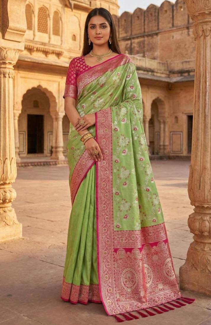 • Saree : Color- Pear / Fabric- Faux Banarasi • Blouse : Color- Pink / Fabric- Faux Banarasi Saree Details