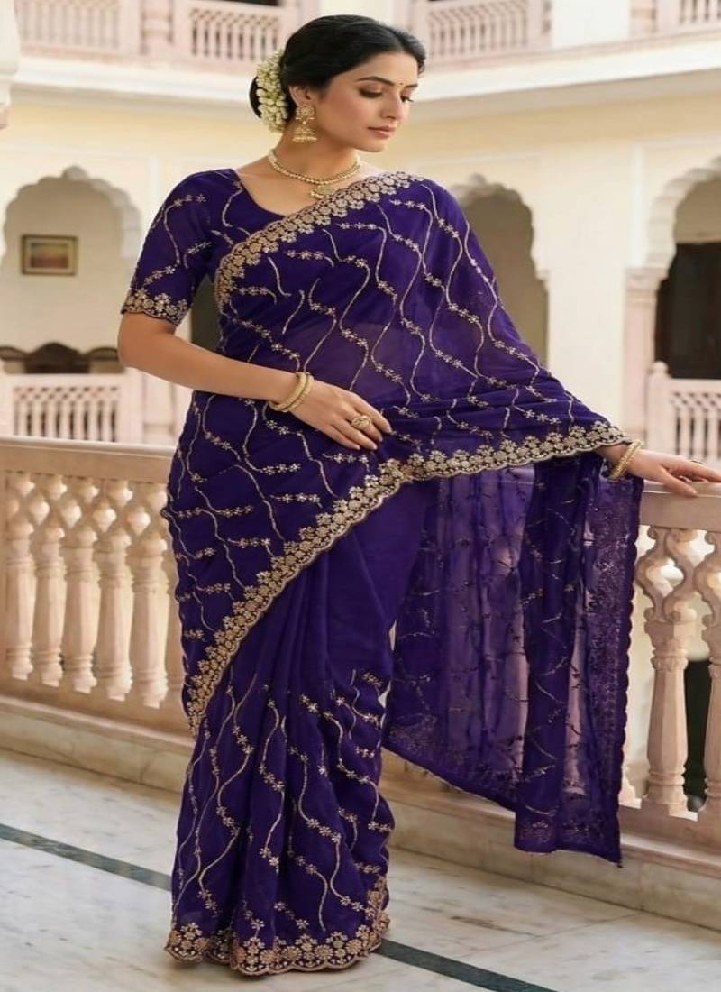 Purple Pure Space Silk Saree With Beautiful Sequence Embroidery Work With Cut Work Border
