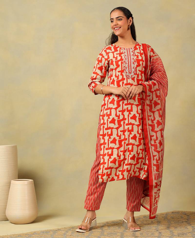 If you find the product for less we'll match it! Know MoreMake a bold and contemporary statement with the Advika Set, featuring a striking crimson red geometric abstract print USP. This sophisticated suit set is rendered in a vibrant red and ivory palette, adorned with an all-over interlocking geometric motif. The kurta is elevated by a detailed round neckline with a white sequin-embellished embroidered central panel, offering a touch of refined shimmer for festive wear. Paired with coordinating vertical-striped trousers and a matching lightweight dupatta that mirrors the abstract and striped patterns, this ensemble provides a cohesive, modern ethnic silhouette.