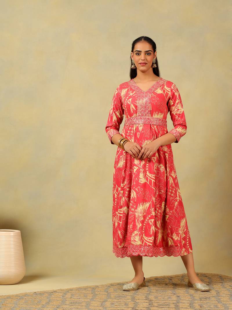 If you find the product for less we'll match it! Know MoreStep into the spotlight with the Anvi Gown, featuring a captivating crimson abstract bloom print USP. This flowy floor-length silhouette is adorned with large, artistic cream-colored botanical strokes against a rich berry-red base. The dress is elegantly defined by its sequined empire-waist belt and a matching V-neckline border, further enhanced by a delicate scalloped embroidered hem for a high-fashion festive Indian look.