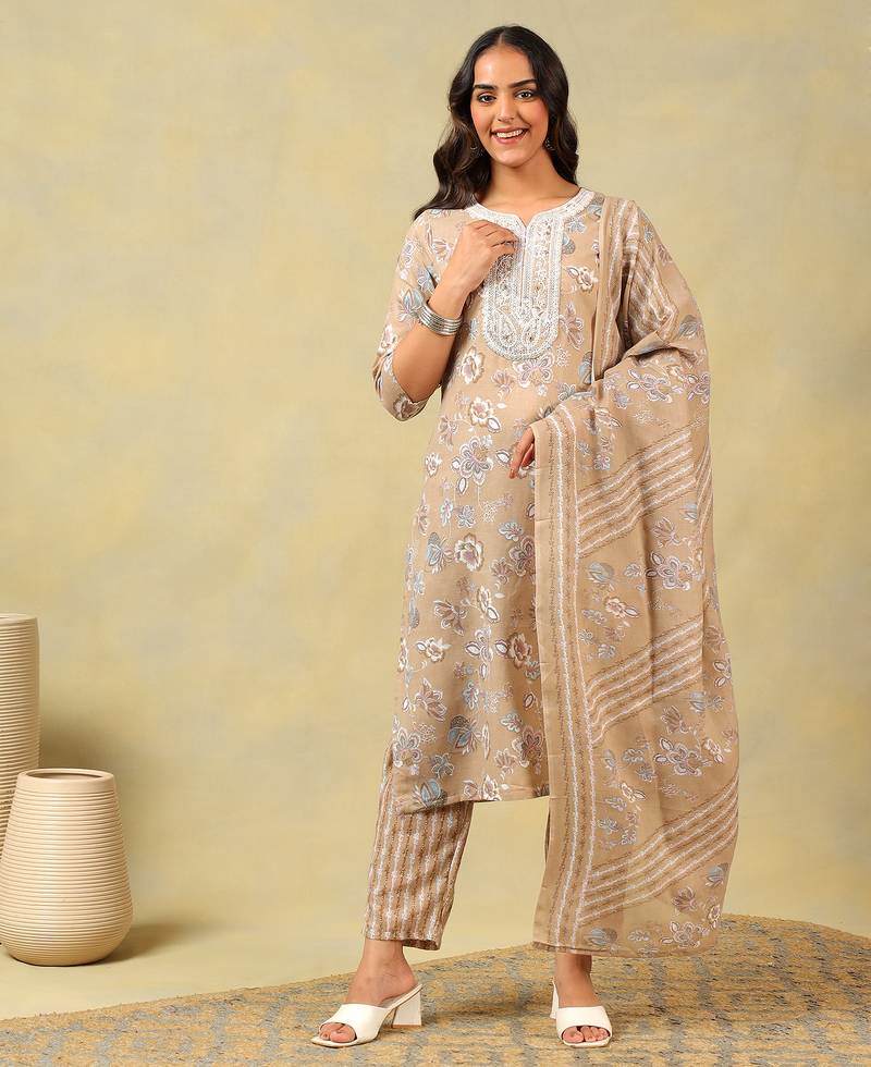 If you find the product for less we'll match it! Know MoreExude effortless sophistication with the Aradhya Set, featuring a graceful taupe floral bloom print USP. This ensemble is rendered in a warm, earthy taupe hue and decorated with delicate, hand-drawn style botanical motifs in soft white and dusty blue. The highlight of this set is the ornate white embroidered U-shaped yoke, which features intricate beadwork and shimmering accents. It is paired with striped taupe trousers and a matching floral-print dupatta for a refined and polished look.