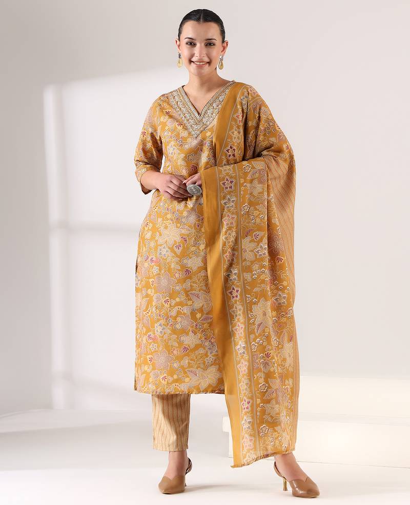 If you find the product for less we'll match it! Know MoreRadiate elegance in the Basanti Bahaar Suit Set, a stunning 3-piece ensemble in a rich mustard-gold hue. This set features a straight-cut kurta drenched in an antique botanical tapestry print with muted earthy tones. The highlight is the deep V-neckline, meticulously detailed with a thick embroidered border of geometric Zari and thread-work. Paired with modern vertical pinstripe trousers and a matching floral dupatta, it offers a perfectly tailored look for festive gatherings or sophisticated daywear.