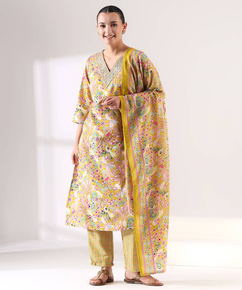 If you find the product for less we'll match it! Know MoreRadiate sunshine and traditional charm with our Basanti Peacock Suit Set. This vibrant 3-piece ensemble features a rich mustard-yellow base adorned with a spectacular large-scale floral and peacock motif print in shades of turquoise, candy pink, and white. The straight-cut kurta is crowned with a V-neckline, meticulously detailed with a shimmering geometric Zari and thread-work border. Designed for festive daytime celebrations, this set is finished with coordinating butti-print trousers and a matching dupatta, ensuring you stand out with grace.