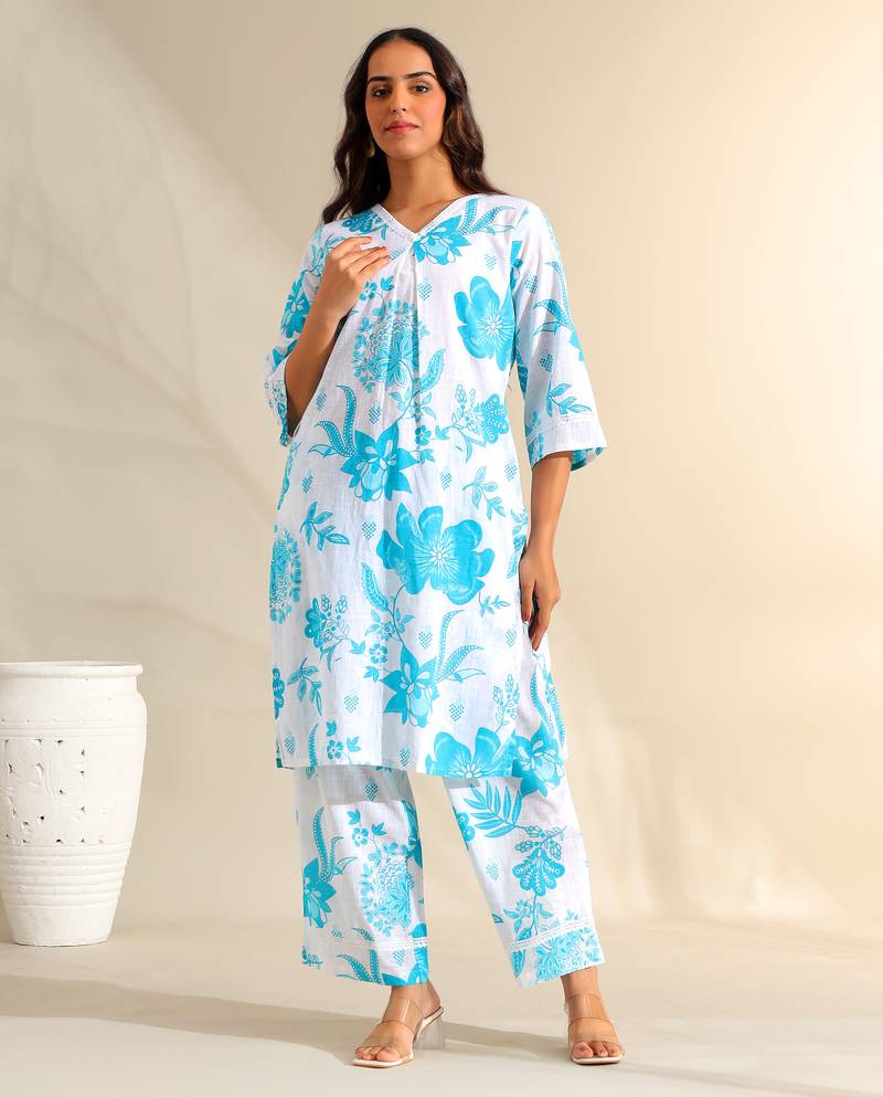If you find the product for less we'll match it! Know MoreBrighten your casual wardrobe with the Diya Set, featuring a vibrant azure floral dream print USP. This refreshing white ensemble is saturated with bold, artistic floral and leaf motifs in a striking shade of sky blue. The kurta features a classic V-neckline with delicate white lace edging and subtle center pleats that add a relaxed flow to the straight-cut silhouette. It is paired with wide-leg trousers that carry the same high-impact floral print, finished with a matching lace border for a cohesive and airy daytime look.