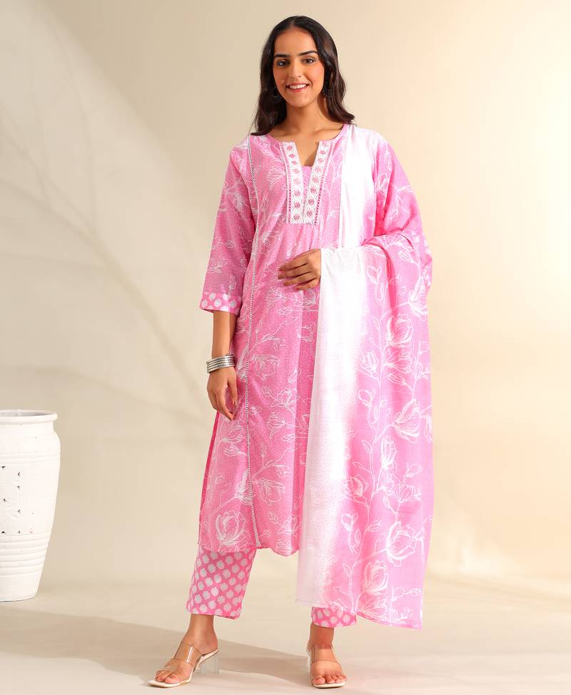If you find the product for less we'll match it! Know MoreStep into the season with the Eshani Set, featuring a vibrant candy-pink garden floral and mirror-work USP. This refreshing suit set is rendered in a bright pink hue and is adorned with a delicate all-over white lily botanical print. The kurta is beautifully detailed with intricate white lace panels at the V-neckline featuring subtle mirror-style embroidery and vertical lace inserts that create a refined, elongated silhouette. The ensemble is completed with coordinating trousers in a playful white polka-dot and geometric block print, along with a matching lightweight floral dupatta for a cohesive and feminine look.