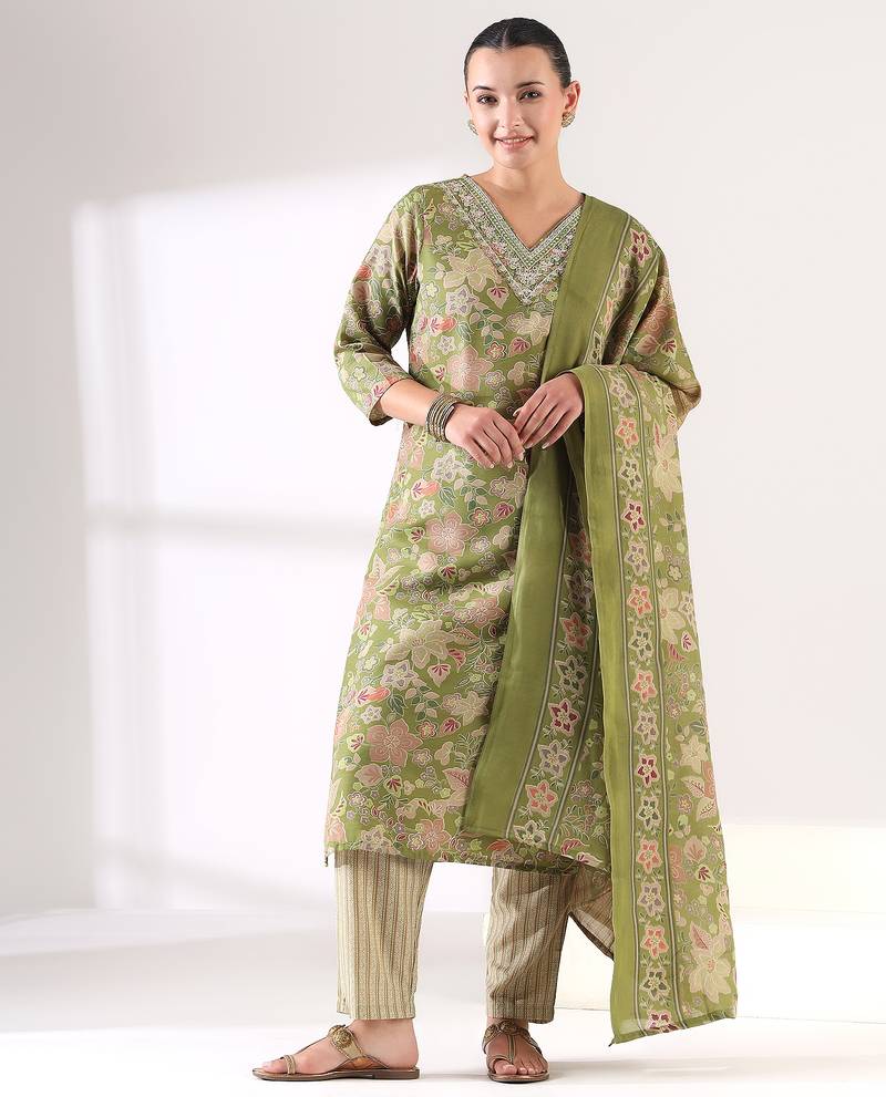 If you find the product for less we'll match it! Know MoreA refreshing sage green 3-piece suit set featuring a lush botanical tapestry print. The kurta is designed with a broad embroidered V-neckline that adds a touch of shimmer. The set includes matching linear-print pants and a floral dupatta to complete the elegant, earthy look.