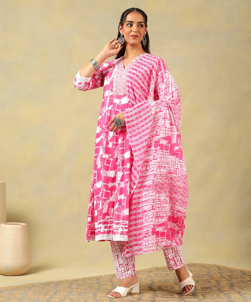 If you find the product for less we'll match it! Know MoreBrighten any occasion with the Ishani Suit Set, featuring a bold radiant abstract print USP. This vibrant pink Anarkali silhouette is adorned with an energetic mix of geometric lines and abstract shapes, creating a modern and artistic ethnic look. The ensemble is highlighted by delicate white lace detailing on the V-neckline and sleeve cuffs, paired with coordinating printed trousers and a light, patterned dupatta for a fresh, spirited traditional style.