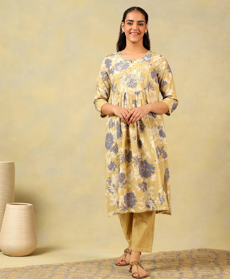If you find the product for less we'll match it! Know MoreStep into effortless style with our Kimaya Kurta-Set, featuring a unique ochre floral bloom print USP. The earthy mustard-yellow base is beautifully adorned with large, dusty-blue floral motifs, creating a sophisticated and natural color palette. This ensemble is defined by its pintuck pleated bodice and an intricately embroidered yoke, offering a graceful, flared silhouette that blends traditional charm with modern comfort.